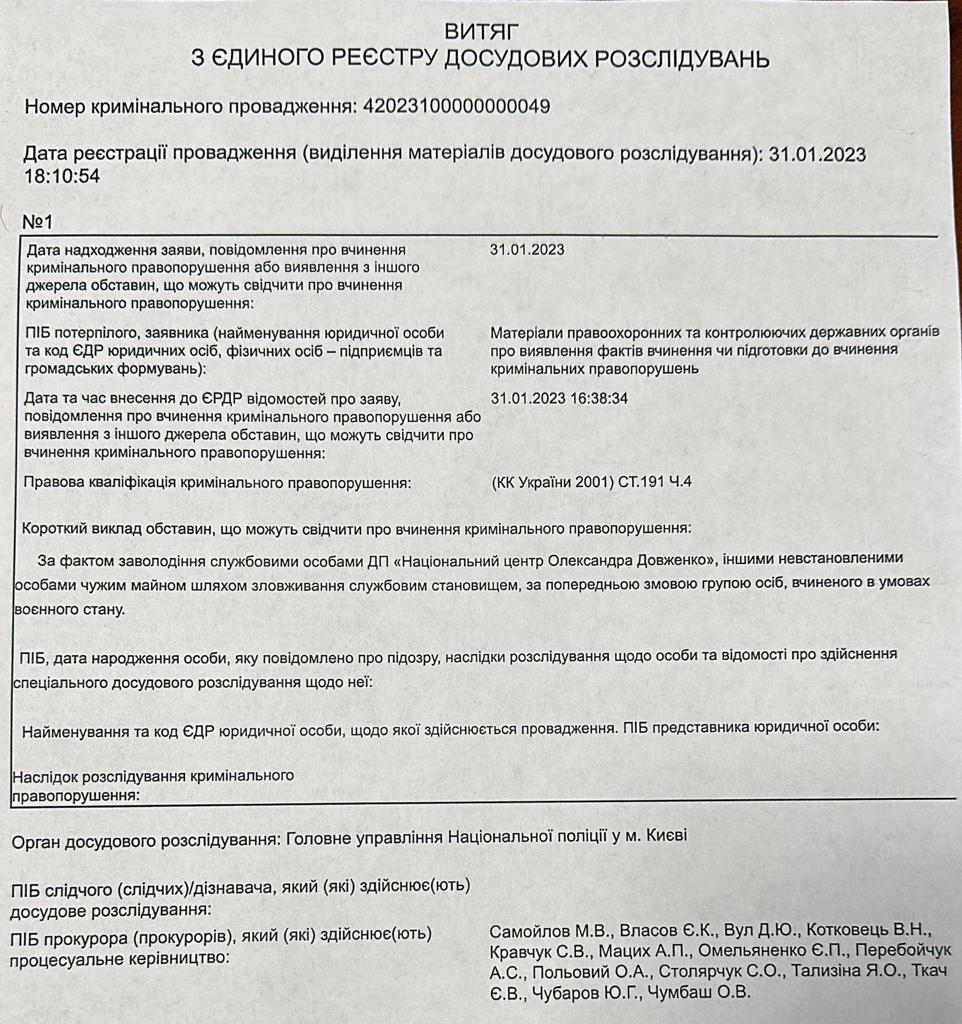 Крім того, як з’ясувалось нещодавно, 31.01.2023 р. Прокуратурою м. Києва до Єдиного реєстру досудових розслідувань внесені відомості за фактом заволодіння державними коштами службовими особами ДП «Національний центр Олександра Довженка» (за ознаками кримінального правопорушення передбаченого частиною 4 статті 191 Кримінального кодексу України).