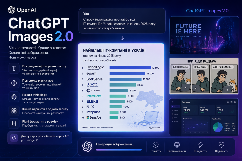OpenAI представила нову версію генератора зображень — ChatGPT Images 2.0, яка інтегрована безпосередньо в ChatGPT і орієнтована на створення складних візуальних матеріалів із підвищеною точністю.