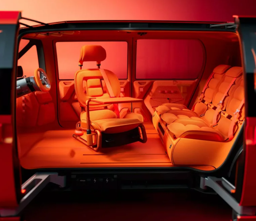Крісло водія можна розвернути проти руху та використовувати разом зі столиком — так авто перетворюється на мобільний офіс. Задній модуль трансформується у спальну зону завдяки надувним матрацам, а відкидний екран дозволяє миттєво перетворити інтер’єр на компактний домашній кінотеатр.