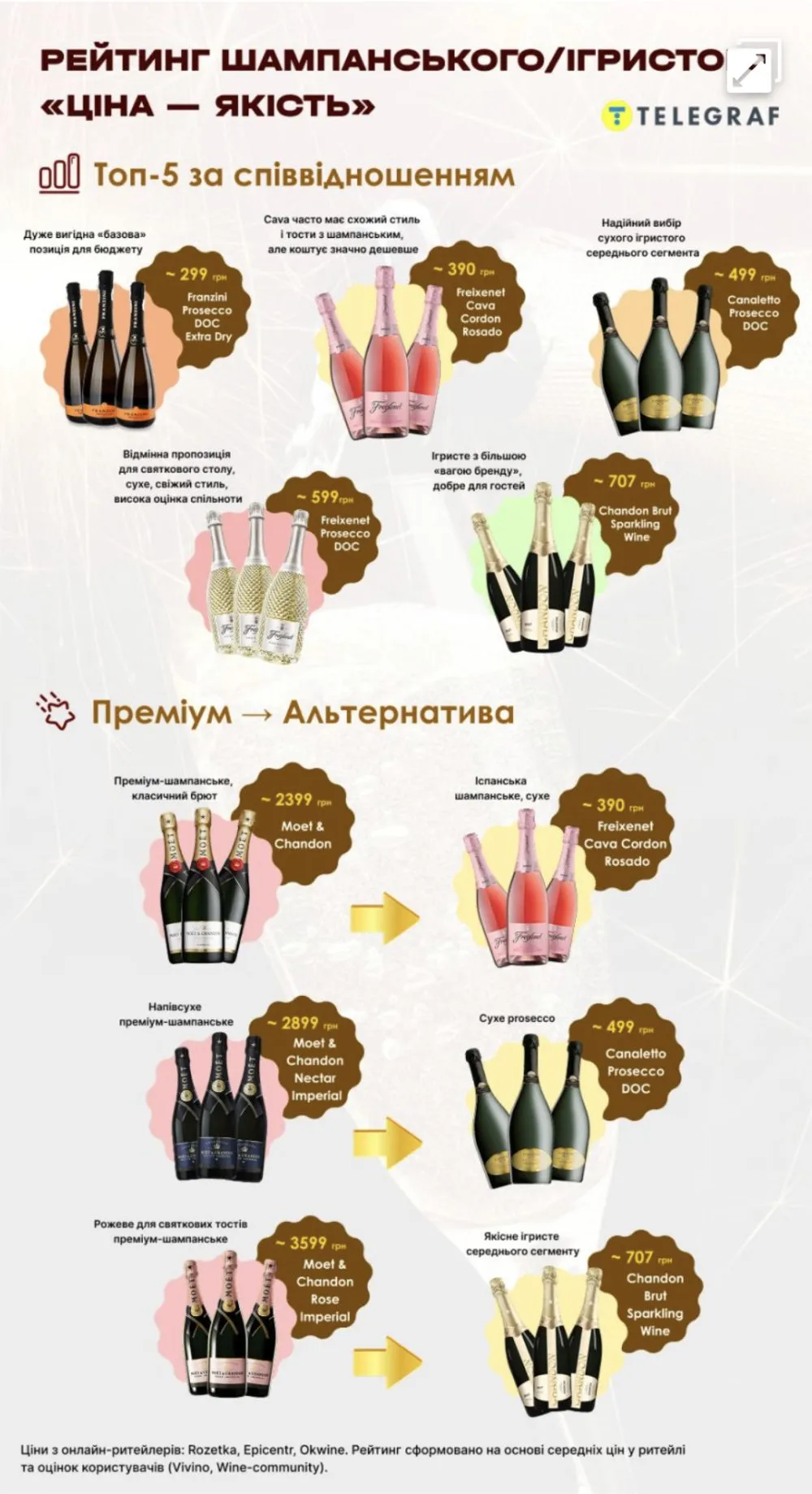 Новорічний стіл не потребує розорення. Українське ігристе за 160-350 гривень цілком конкурує зі світовими брендами — перевірено відгуками тисяч людей. Якщо хочеш врівноважити ціну та якість, Inkerman дає найкращий результат. Для любителів імпорту є Freixenet — непогано і недорого. А от французькі гіганти типу Moët варто купувати лише заради ефекту, бо переплата не виправдовує різницю у смаку.