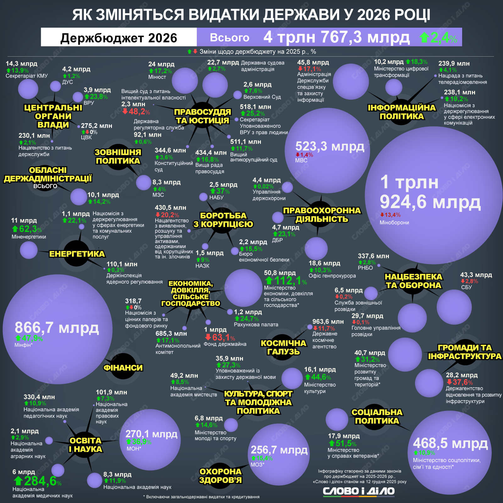 У державному бюджеті на наступний рік, який днями підписав президент Володимир Зеленський, загальний обсяг видатків сягає майже 4,8 трлн грн. Також у документі – рекордний дефіцит, майже у 19%. Попри це, у 2026 році зросте мінімальна заробітна плата та прожитковий мінімум, підвищать зарплати вчителів та збільшать виплат при народженні дитини. Також у порівнянні з поточним роком зростуть витрати на Верховну раду, секретаріат Кабміну, ВРП. Більше грошей у 2026 році отримають й низка міністерств – МОН, МОЗ, Мінекономіки, Міненерго, Мінкультури, Мінцифри, Мінветеранів та ДБР. «Слово і діло» проаналізувало головний фінансовий документ країни і пропонує подивитися, як зміняться витрати держави у 2026 році порівняно з поточним роком.