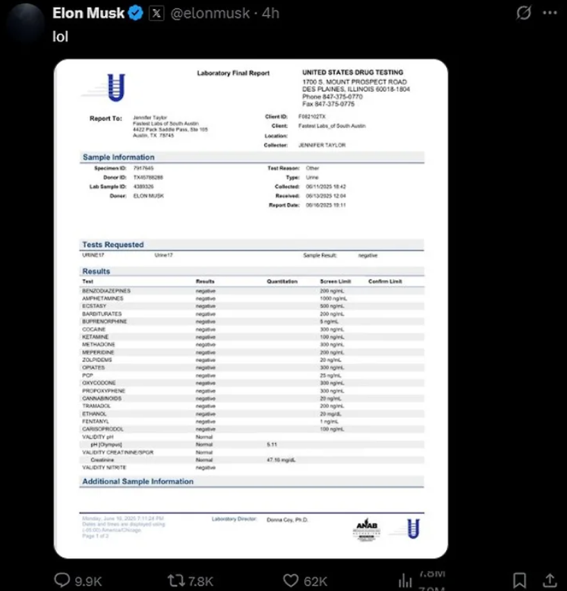 Згідно з документом, опублікованим Маском, усі тести — на кетамін, кокаїн, амфетамін, МДМА та інші наркотики — виявилися негативними