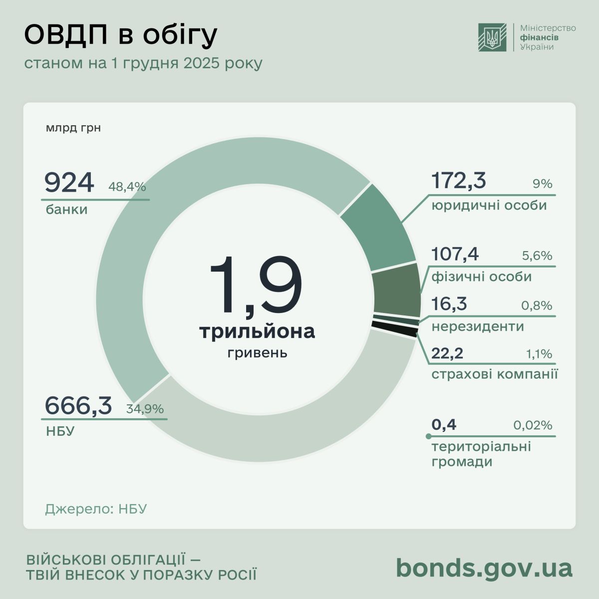 Станом на 1 грудня 2025 року в обігу перебувають державні облігації на понад 1,9 трлн гривень. Найбільшу частку тримають комерційні банки — 48,4%, далі Національний банк України — 34,91%. Частки інших інвесторів становлять: 9,03% у юридичних осіб, 5,63% — у фізичних осіб, 1,16% — у страхових компаній, 0,85% — у нерезидентів та 0,02% — у територіальних громад.