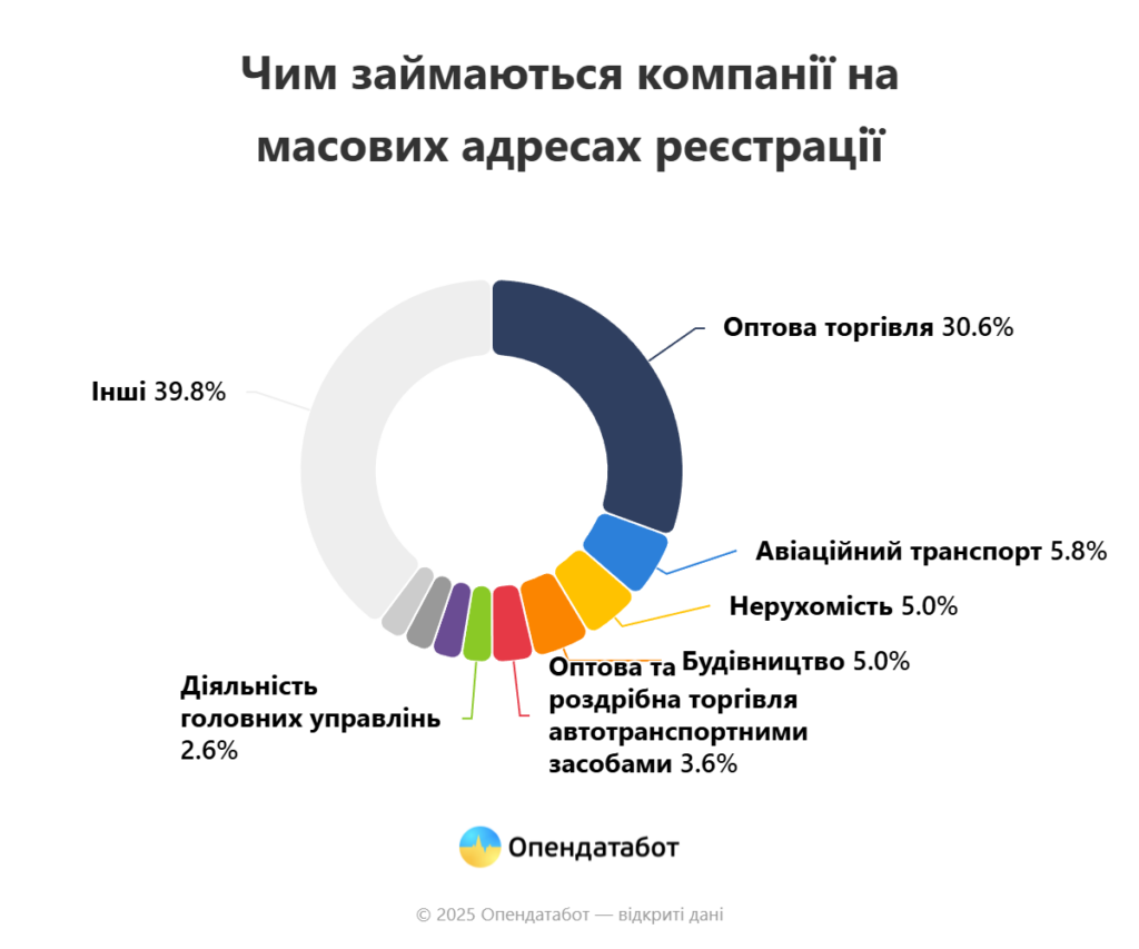 Загалом 180 тис. компаній зареєстровано на масових адресах, з яких 83% залишаються чинними. Найбільший сегмент діяльності — оптова торгівля, не пов’язана з автотранспортом чи мотоциклами: 30,6%, або приблизно 45,7 тис. компаній.