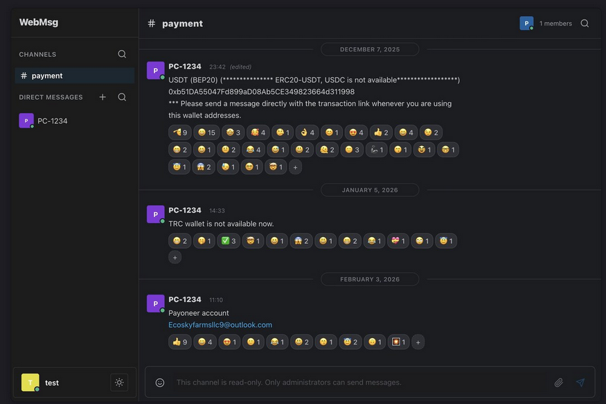 - Листування користувача «Rascal» із адміністратором PC-1234 у месенджері WebMsg. У них детально описані перекази платежів та використання фальшивих особистостей у період із грудня 2025 року по квітень 2026 року.