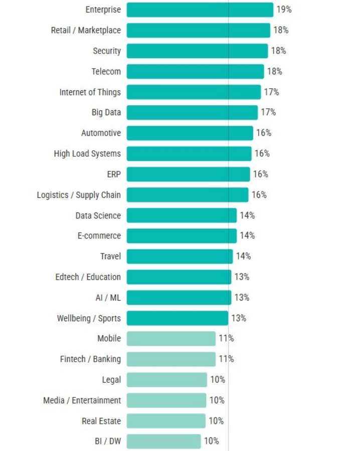 Найменша кількість (до 10%) у GameDev, Adtech / Marketing, Medtech / Healthcare, Hospitality, Insurance, SaaS, Cloud Computing, Blockchain, Gambling та Domains / Hosting.