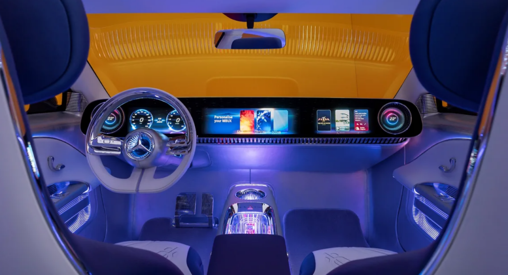 У салоні встановлені чотири роздільні сидіння, а роль панелі приладів відіграє комплекс Superscreen – екран на всю ширину передньої панелі з окремими сенсорними екранами в “повітропроводах” системи вентиляції. Нові моделі отримають фірмову оперативну систему MB.OS на базі чіпа NVIDIA.