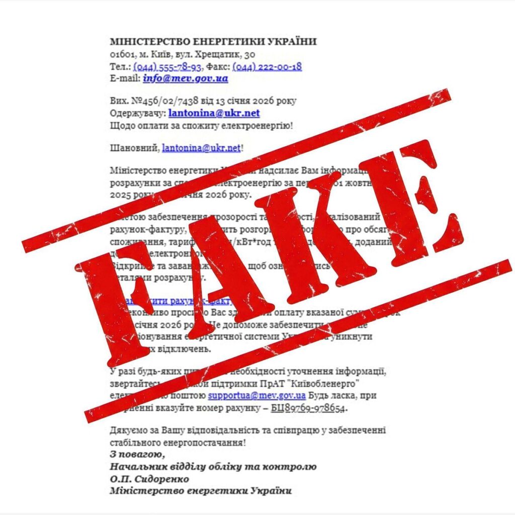 У відомстві також попередили, що вкладення можуть містити шкідливе програмне забезпечення. Його відкриття створює ризик несанкціонованого доступу до комп’ютерів і даних, зокрема до корпоративних документів, пошти та облікових записів. Міненерго закликає не відкривати файли, не переходити за посиланнями з таких повідомлень і не виконувати жодних оплат.
