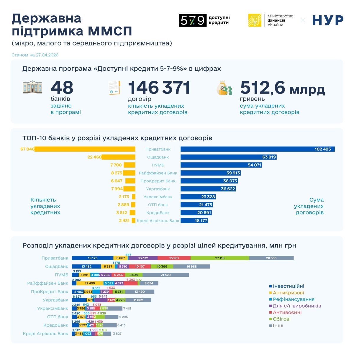 Всього з моменту старту Програми підписано 146 371 кредитний договір на 512,6 млрд грн, з них банками державного сектору економіки – 100 154 договори на 233,6 млрд гривень.