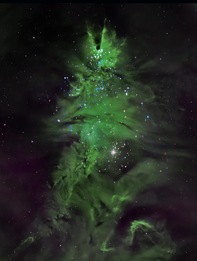 Національне управління з аеронавтики та дослідження космічного простору (NASA) опублікувало новий знімок космічної «Різдвяної ялинки». Її утворює скупчення молодих зірок, які отримали назву NGC 2264.