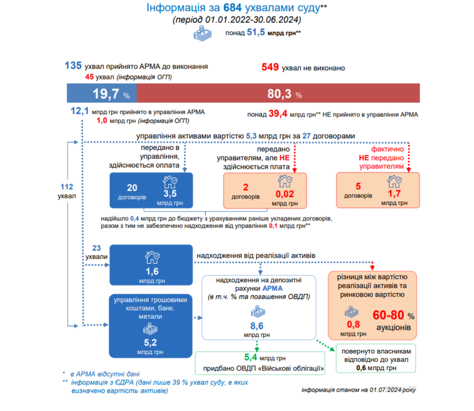 🔺 Неефективне виконання судових ухвал – з 684 ухвал, передбачених для АРМА, лише 135 реалізовані. 39,4 млрд грн активів досі не передані в управління, що означає втрачений дохід для держави.