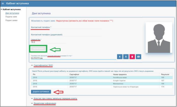 Уже в кабінеті треба буде додати контактні номери та завантажити власне фото (розмір до 1 Мб, не селфі, адже заклади можуть його використовувати для замовлення студентського квитка). Якщо потрібно, також зазначте дані інших сертифікатів НМТ (ЄВІ) або документів про освіту (наприклад, ви реєструвалися на документ про повну загальну середню освіту, а маєте також диплом молодшого спеціаліста, ці документи можна використовувати як різні основи вступу).
