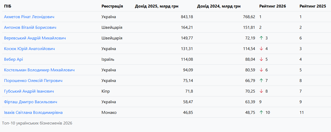 Абсолютним лідером залишається Рінат Ахметов із доходом компаній понад 843 млрд грн. Друге і третє місця займають Віталій Антонов (164 млрд грн) та Андрій Веревський (149,7 млрд грн). До десятки також входять Юрій Косюк, Володимир Костельман, Олексій Порошенко та Дмитро Фірташ. Єдина жінка у топ-10 — Світлана Івахів, яка замикає топ з доходом близько 46,9 млрд грн.