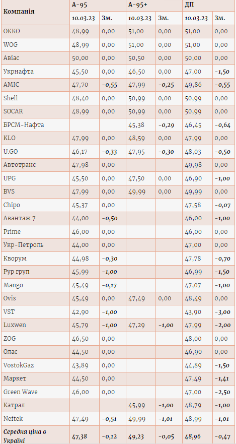 Тенденція падіння цін на пальне на автозаправних станціях хоч і трохи знизилась, але загалом тримається: з 3-го по 10-те березня бензини в середньому втратили в ціні 5-12 коп./л, до 47,38-49,23 грн/л, дизельне пальне – 47 коп./л, до 48,96 грн/л.