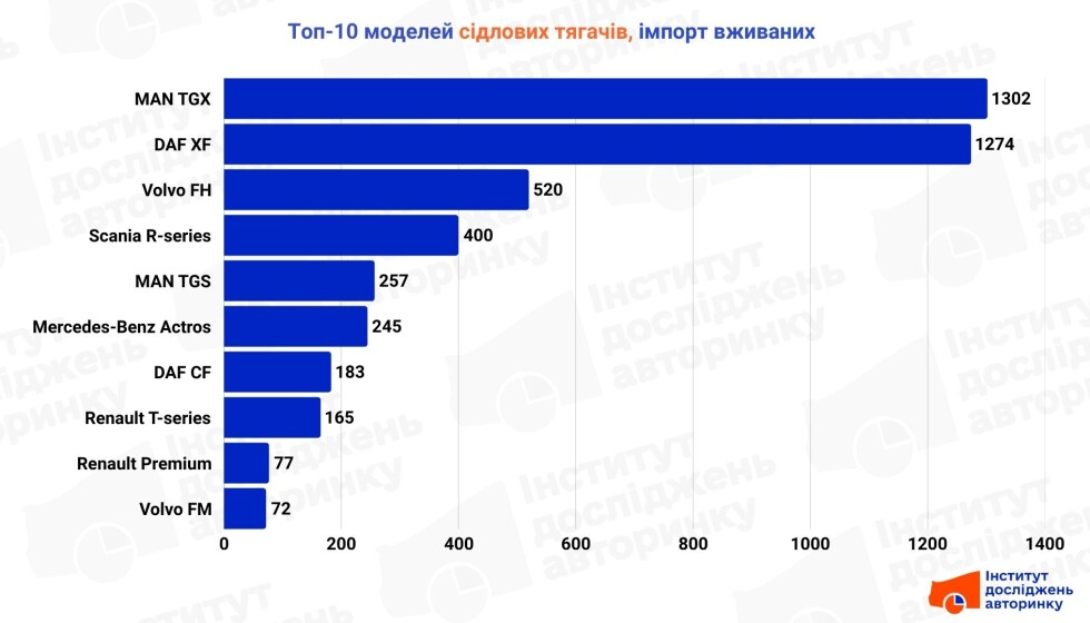 У сегменті “пригону” з Європи основна боротьба розгорнулася між MAN TGX та DAF XF – ці дві моделі займають понад 50% усього імпорту вживаної техніки.