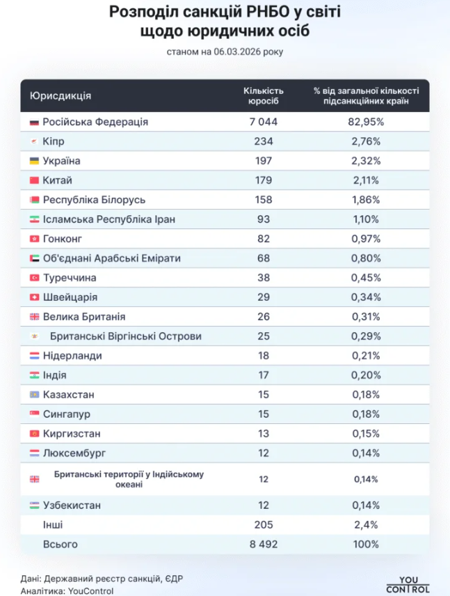 Станом на березень 2026 року під санкціями РНБО перебувають 8492 юридичні особи з 77 країн світу. Про це свідчить дослідження R&D-центру YouControl.