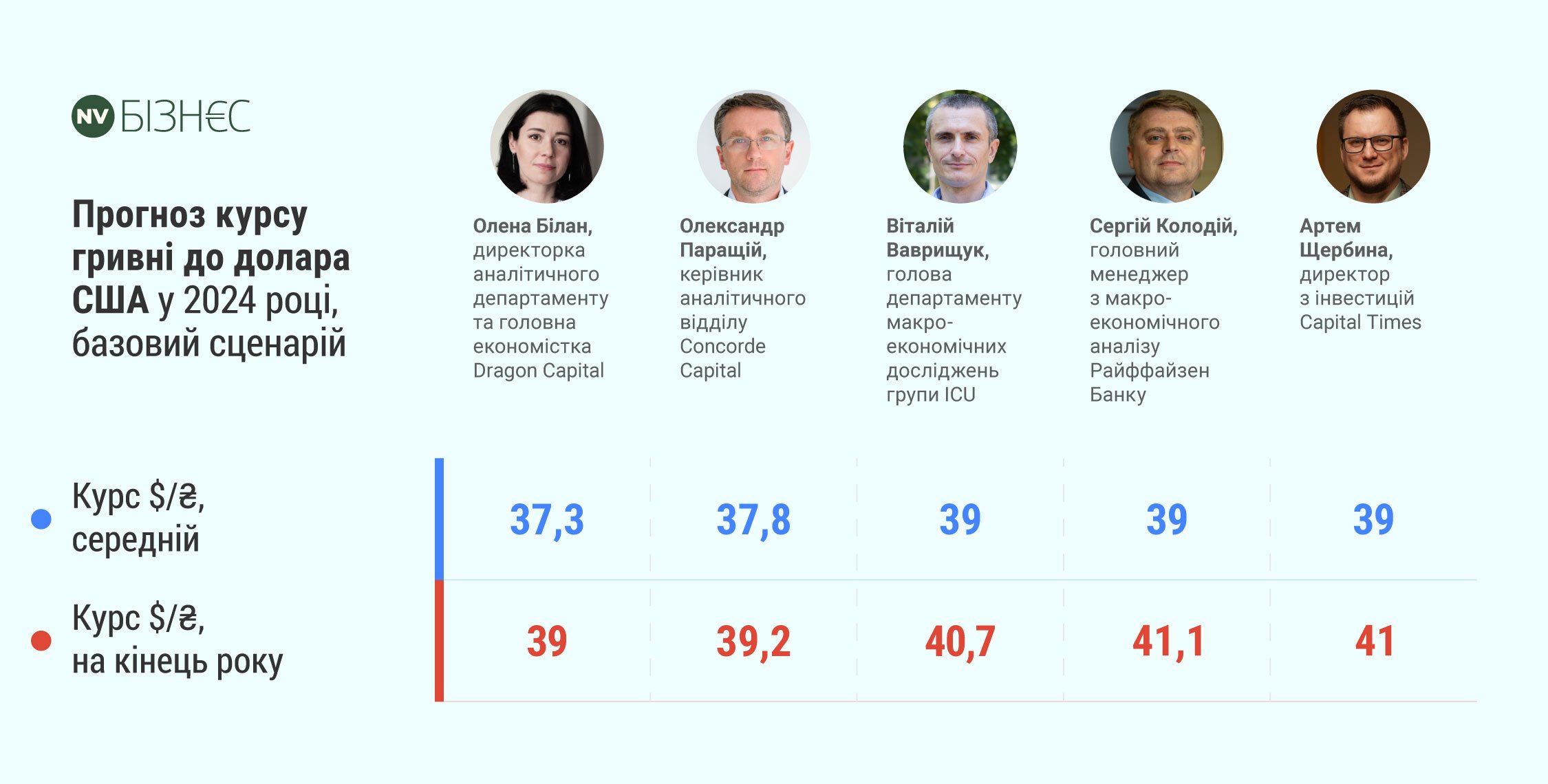 Артем Щербина із Capital Times очікує, що у 2024 відбудеться девальвація гривні. «Основні аргументи: — відсутність достатнього обсягу міжнародного фінансування для поповнення резервів НБУ, а отже — менше інструментів утримання курсу — проблема критичного дефіциту бюджету та слабкого експорту — за таких умов можливе покриття дефіциту за рахунок емісії», — сказав він.