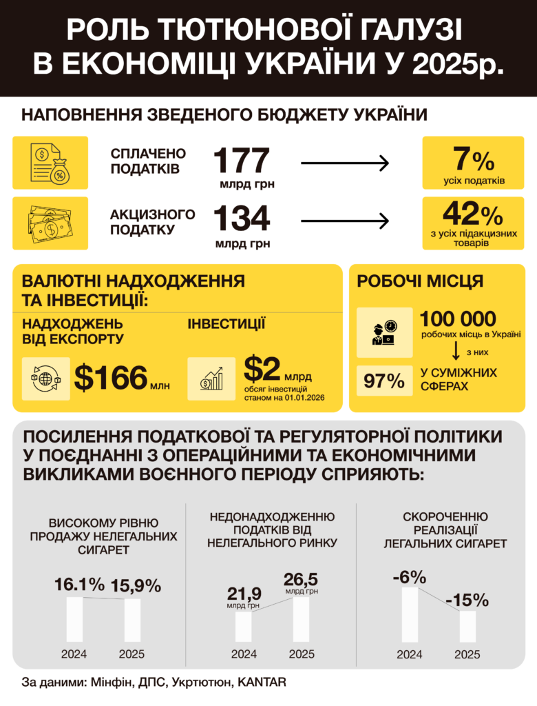 Окрім цього, компанії-члени Асоціації “Укртютюн” у 2025 році забезпечили понад 166 млн доларів США валютних надходжень від експорту тютюнових виробів, а загальна сума інвестицій в економіку України склала понад 2 млрд доларів США.