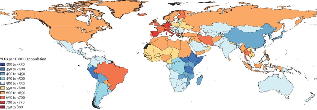 Кількість років, втрачених через пов’язані з головним болем розлади, у різних країнах світу на 100 тисяч населення. Червоним кольором позначено країни, у яких люди найбільше страждали від головного болю, синім — де найменше. Hus⊘y et al. / The Lancet Neurology, 2025