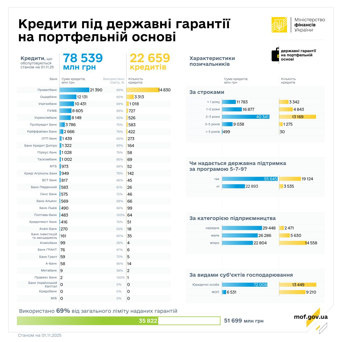 Станом на 1 листопада 2025 року 28 банків-кредиторів обслуговують 22 659 кредитів на суму 78 539 млрд гривень