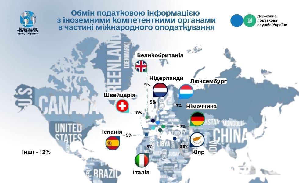Згідно з даними ДПС, переважна більшість спеціальних запитів про отримання податкової інформації скеровується до компетентних органів: Республіки Кіпр – 32%, Швейцарії – 18%, Великобританії – 9%, Німеччини та Люксембургу – по 7%, Нідерландів, Італії та Іспанії – по 5%, інших країн – 12 %.