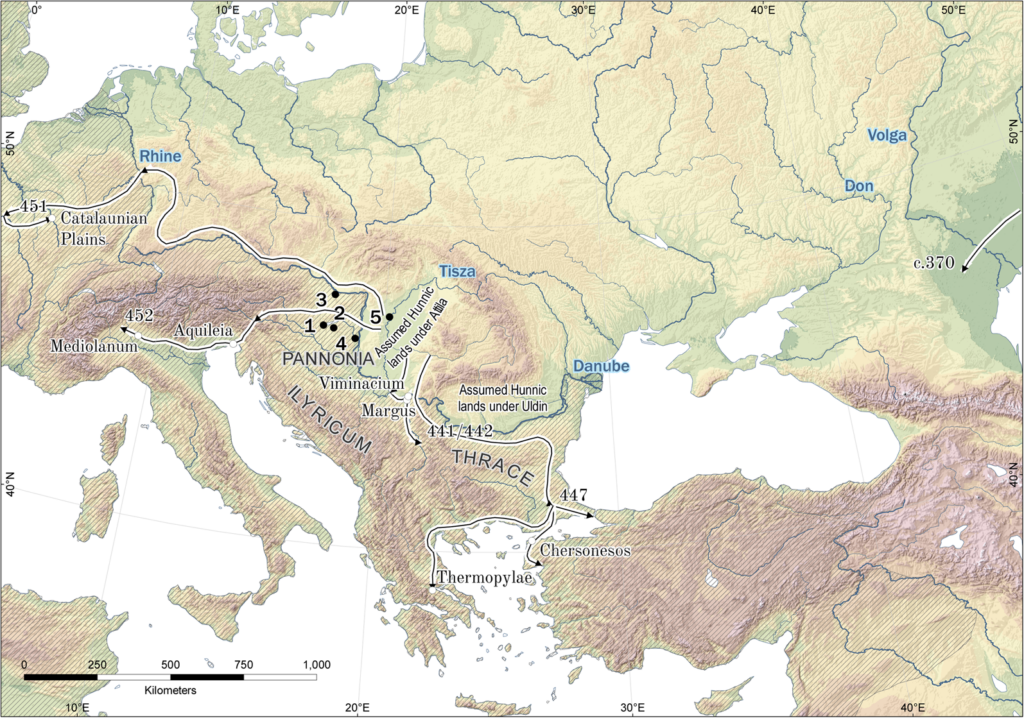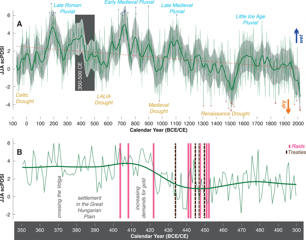 При цьому, якщо поточне датування історичних подій вірне, найбільш руйнівні гуннські набіги 447, 451 і 452 н. е. збіглися з надзвичайно посушливим літом у Карпатському басейні.