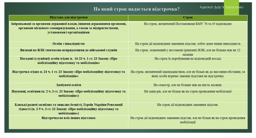 Як розповідає адвокат, відстрочка від мобілізації надається на різні строки залежно від підстави:
