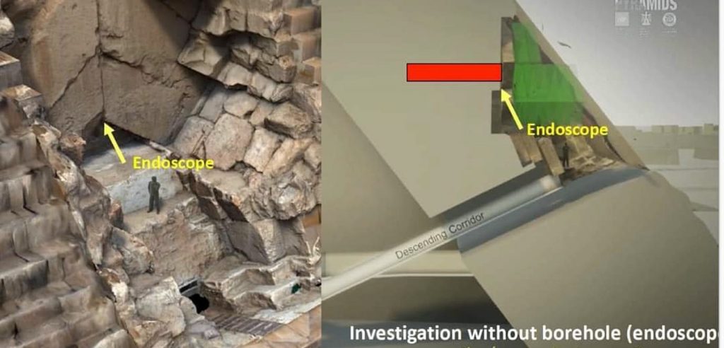 Щоб дізнатися більше про це приміщення, дослідники вставили ендоскоп у коридор та заглянули всередину. Попередній огляд показав, що приміщення порожнє і в ньому не видно будь-яких артефактів. За попередньою гіпотезою, це приміщення являло собою господарську споруду, яка могла, наприклад, служити для доставки вантажів усередину піраміди.