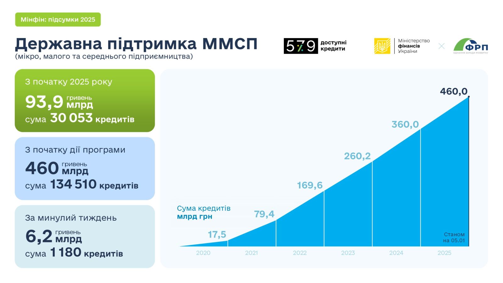 З початку 2025 року за Державною програмою «Доступні кредити 5-7-9%» представники мікро-, малого та середнього бізнесу отримали від уповноважених банків 30 053 пільгових кредитів на загальну суму 93,9 млрд гривень. З них від банків державного сектору економіки – 20 873 кредитів на 48,8 млрд гривень.