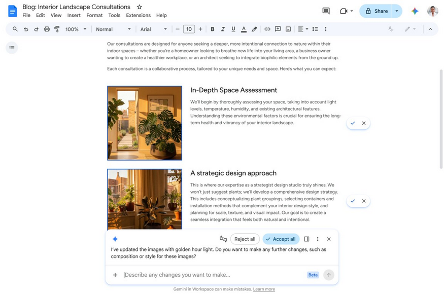 Для работы с текстами в Google Docs введены инструменты для создания и улучшения контента. Пользователи могут попросить Gemini «помочь написать» документ или адаптировать текст к своему стилю, имитируя собственный голос. Система использует контекст по предварительной переписке Gmail и документов на Google «Диске» для создания самых релевантных черновиков.