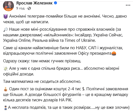 Ранее расследование о Telegram-каналах «миллионники» опубликовал нардеп Ярослав Железняк. Речь идет о пабликах «Инсайдер», «Украина Сейчас», «Украина Online», «Реальная война» и «Times of Ukraine».