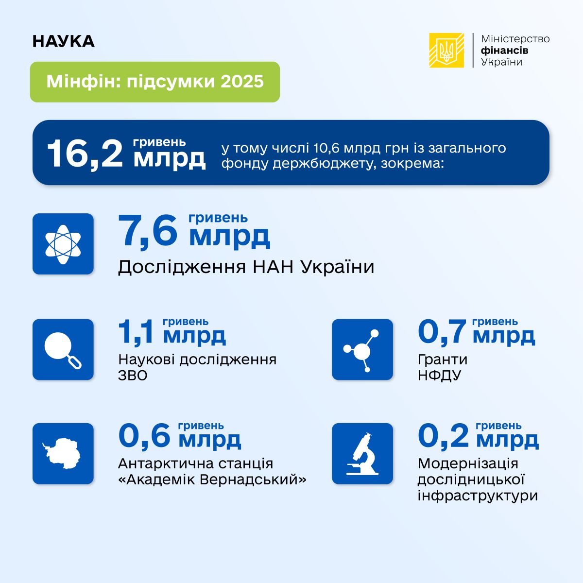 На развитие науки в 2025 году из государственного бюджета было выделено 16,2 млрд. грн., из них по общему фонду 10,6 млрд грн.