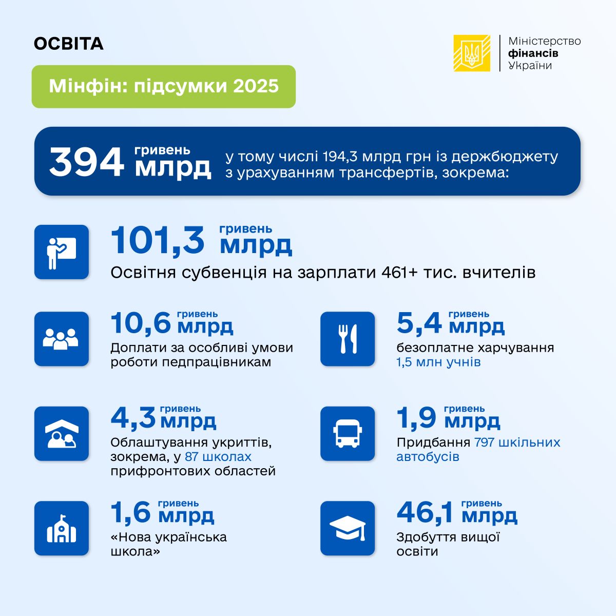 На развитие образования в 2025 году было направлено 394 млрд. грн., в том числе 194,3 млрд. грн. из государственного бюджета с учетом трансфертов, в частности: