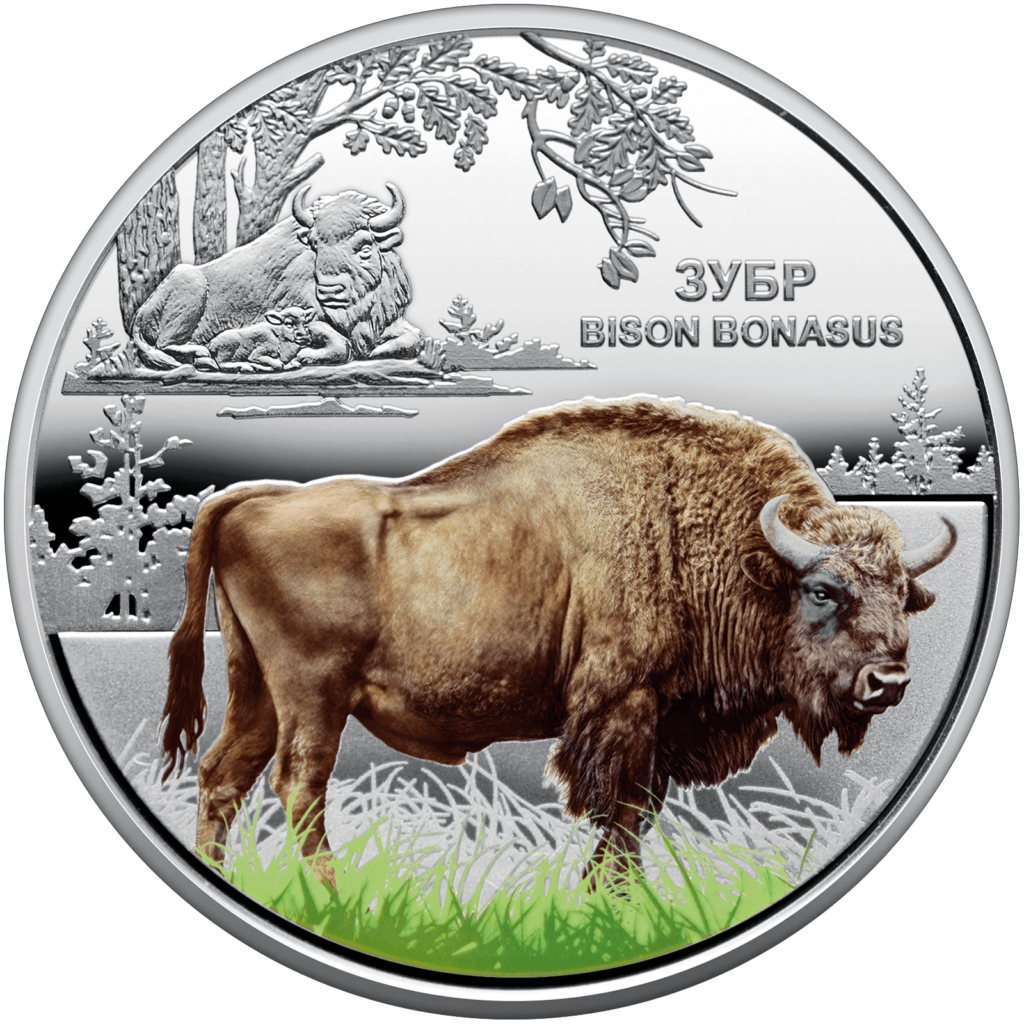 На реверсе — цветное изображение зубра на фоне природного пейзажа, подчеркивающее идею возвращения дикой природы на территории, долго считавшиеся непригодными для жизни.
