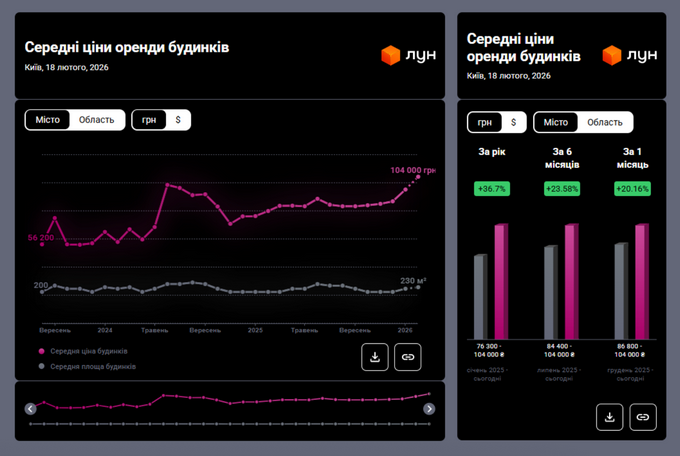 По данным аналитиков, в конце прошлого года аренда дома в столице стоила на 17 тыс. грн дешевле, чем сейчас. Средняя стоимость аренды автономного жилья в Киеве выросла с 86,8 тыс. грн. в декабре 2025 года до 104 тыс. грн.