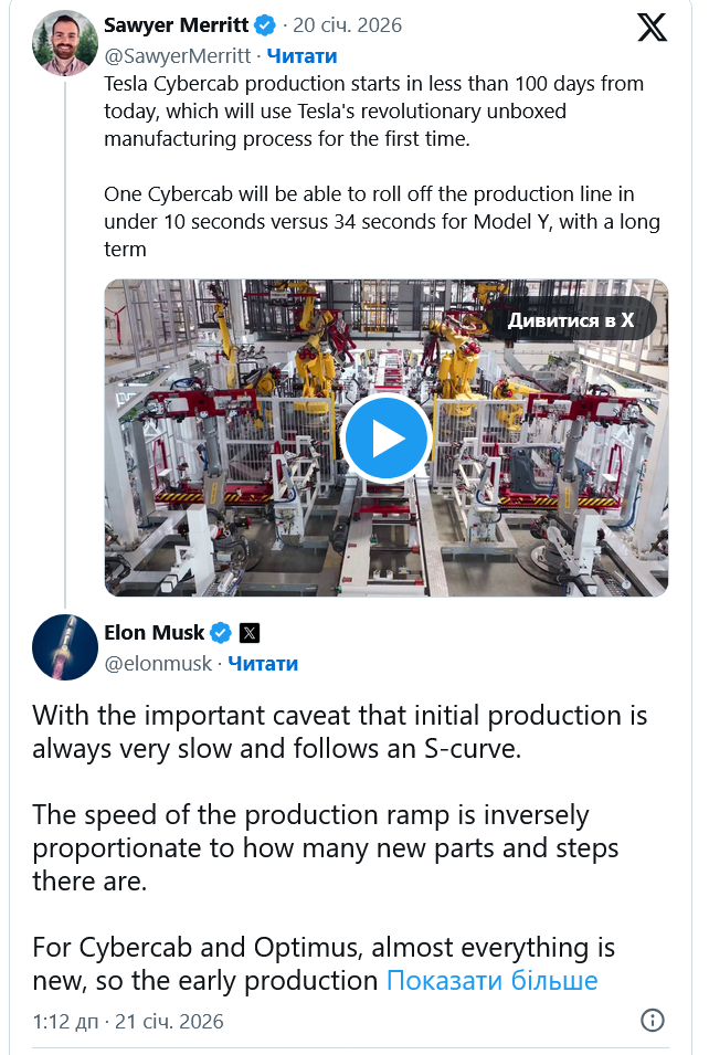 Стоит отметить, что Маск ранее писал в X, что начальное производство гуманоидных роботов Optimus и робота Cybercab “будет очень медленным” из-за новизны процессов. В то же время он добавил, что со временем производство станет гораздо быстрее.