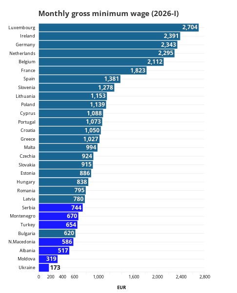 По состоянию на январь 2026 года среди стран-членов ЕС минимальная месячная брутто-зарплата колеблется от 620 евро в Болгарии до 2704 евро в Люксембурге. Если учитывать страны-кандидаты, то Украина имеет самый низкий показатель – 173 евро, за ней следует Молдова с 319 евро. Об этом сообщает Euronews.