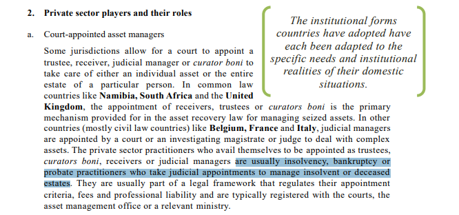 “В країнах загального права, таких як Велика Британія, Намібія та ПАР, суди мають повноваження призначати судових керуючих (receivers, trustees, curators boni) для управління арештованими активами”.