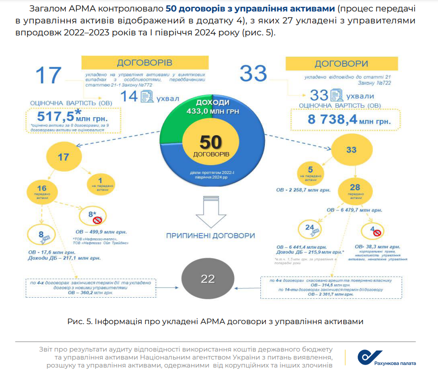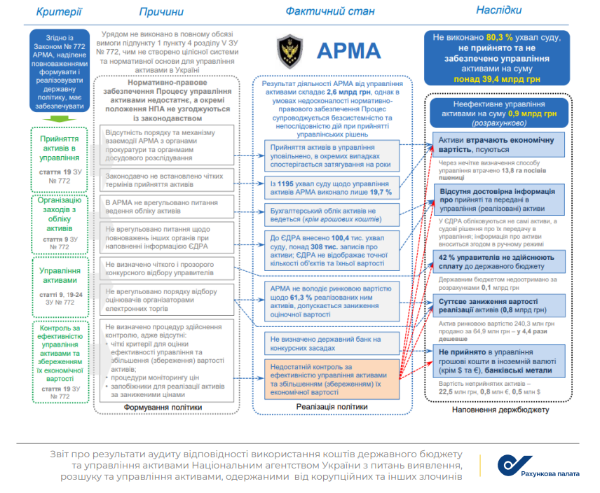 Проблеми починаються з неефективного управління активами. Із 100 447 ухвал суду про арешт активів лише 1,1% (1195 ухвал) передбачали передачу активів в управління АРМА. Проте навіть із цих активів агентство виконало лише 19,7% ухвал, що свідчить про низьку спроможність виконувати свої функції. Це призвело до того, що в період 2022–2024 років в управління не було прийнято активи на суму понад 39,4 млрд грн, що спричинило втрати потенційних доходів у розмірі 6 млрд грн.